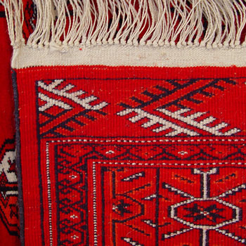 HAND TIED BOKHARA CARPET: Approx 5' 10'' X 4' 2''. Vivid red background.