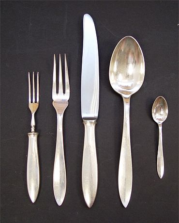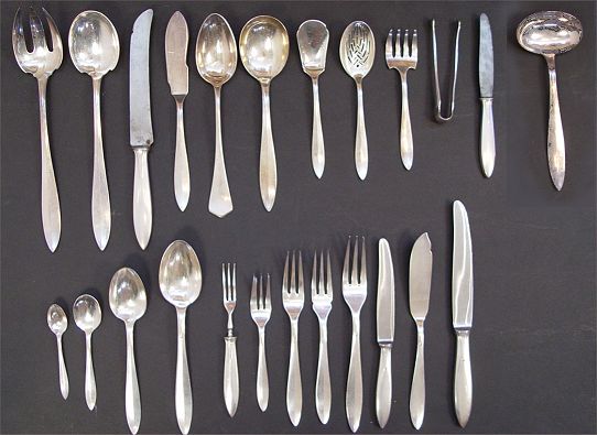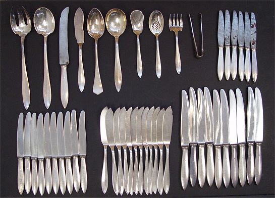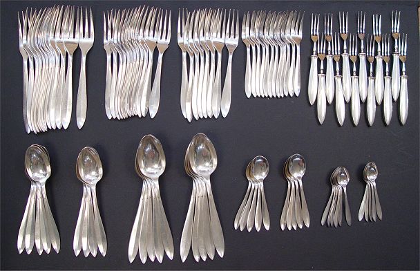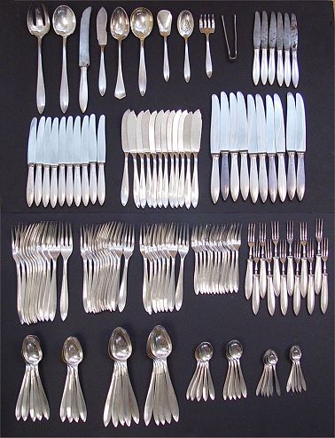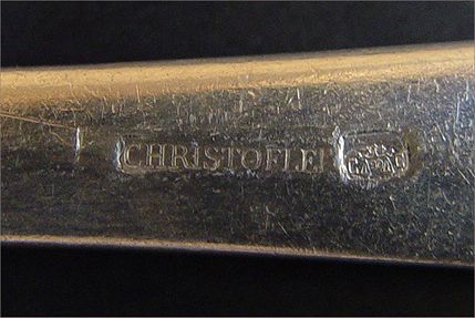 LARGE CHRISTOFLE FRENCH SILVERPLATE FLATWARE SERVICE: 144 Pieces to include 10 dinner knifes (9 3/4''), 10 luncheon knives (8''), 12 dinner forks (8 1/2''), 8 luncheon forks, 10 large tablespoons, 9 tablespoons, 12 fish knives, 12 cocktail forks, 6 butter knives, 12 pastry forks, 12 salad forks, 11 demi-tasse spoons, 10 teaspoons. Serving pieces include 2 piece salad servers, carving knife, gravy ladle, sugar tongs, sardine fork, slotted server, master butter and sugar shovel.
