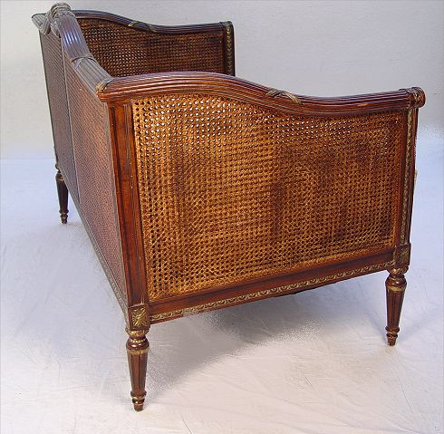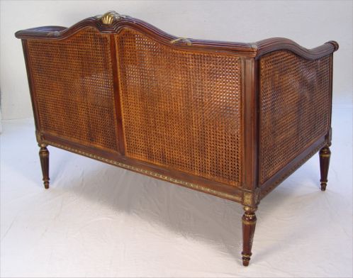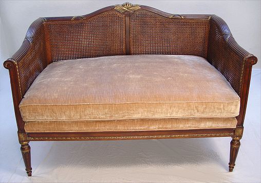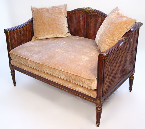MAITLAND SMITH CANED BACK FRENCH STYLE SETTEE: Double caned, velvet cushion and pillows. 34'' high X 51 1/2'' long X 52'' deep.