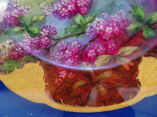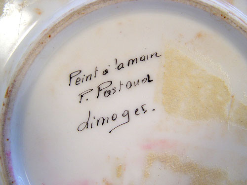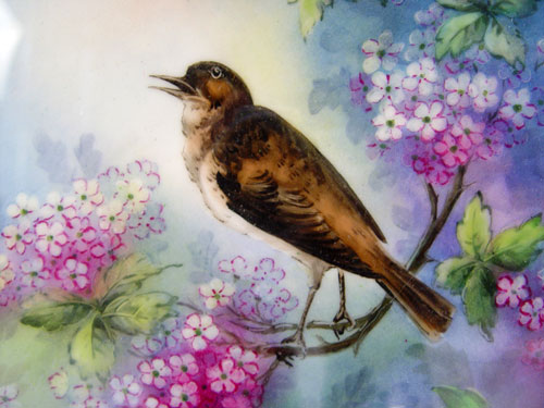 HAND PAINTED BIRD DECORATED FRENCH LIMOGES CHARGER: Written in script Limoges, signed P. Postouel. Factory mark ''AH & Co. France''. Framed under glass, easily removed. The charger is 15'' dia.