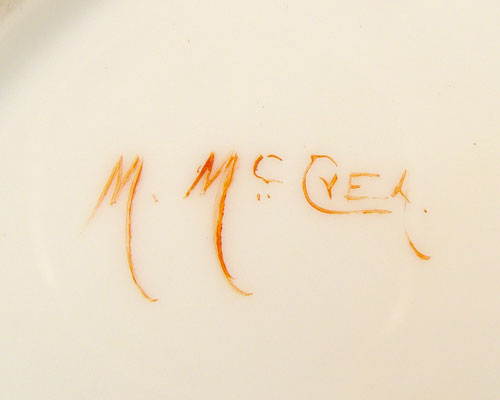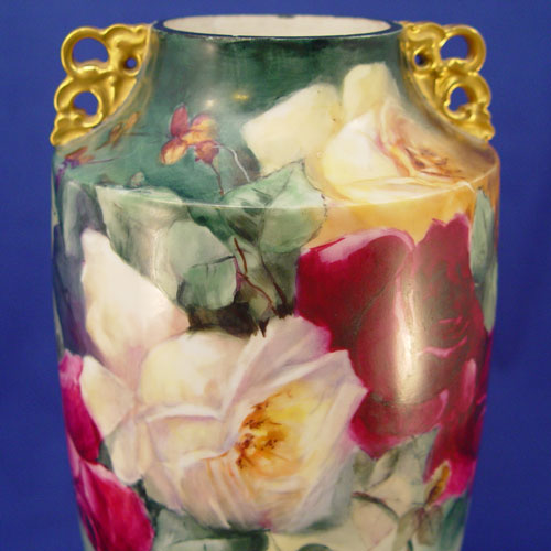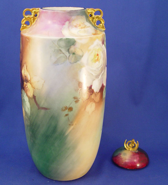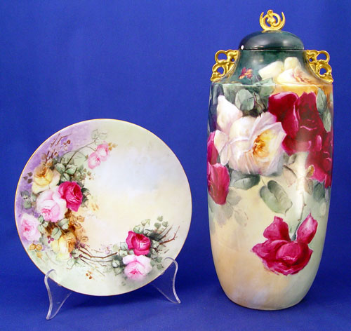 ROSE PAINTED FRENCH LIMOGES COVERED VASE AND PLATE: Hand painted in vivid colors, artist signed and dated - M. Mc Crea 1902. William Guerin mark, Limoges France. 15'' tall. Please note chip on lid. Sold with a plate signed by the same artist, also hand painted in roses, 9'' dia., Jean Pouyet mark ca. 1891-1932.