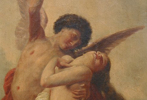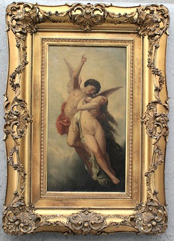 19TH C. OIL/C OF CUPID AND PSYCHE: Unsigned, 14 1/2'' x 8'', gilded gesso frame with wear and missing gesso, 23'' x 16''. Tear to canvas, needs cleaning.