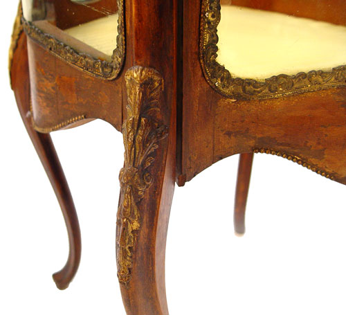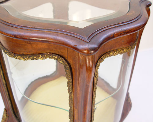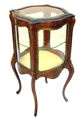 FRENCH VITRINE CURIO CABINET: Beveled glass top, serpentine glass sides and door. Interior with single glass shelf, fabric covered bottom. 38 1/2''h. x 20''. Please call for condition.