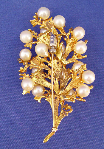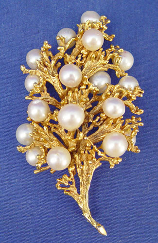 CULTURED PEARL BRANCH BROOCH: 14k yellow gold brooch in the shape of a branch of coral set with 16 off-round and baroque shaped cultured pearls, measuring 7.50 - 10.00 mm, cream in color, medium luster. Bar pin closure. 3 1/2'' x 2'', 44.4 grams.