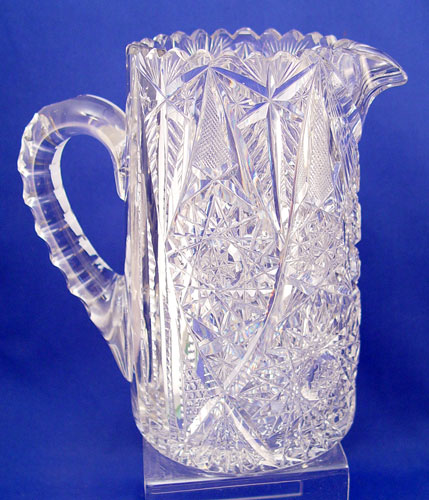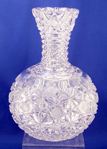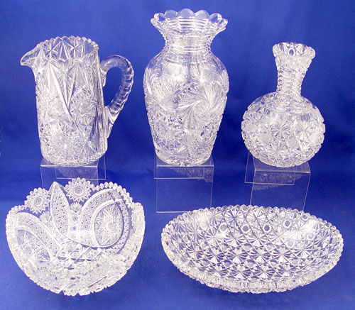 5 PIECE GROUP AMERICAN BRILLIANT CUT GLASS: 1) Ice cream tray 11'' long; 2) Vase 10'' high (rim chips); 3) Pitcher 8'' high; 4) Water decanter 8'' high; 5) Bowl 8 1/2'' dia.