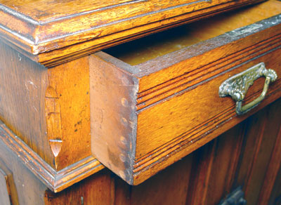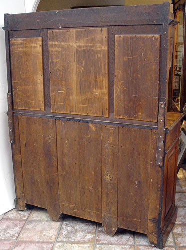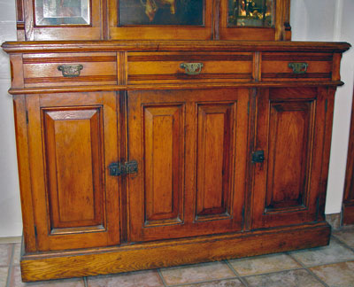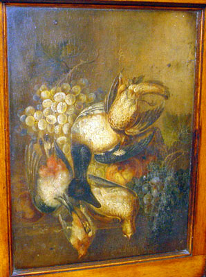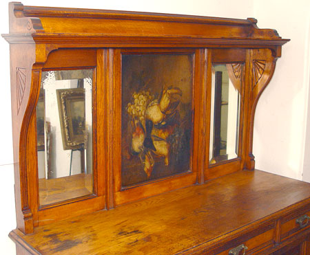 19TH C OAK AND PAINT DECORATED SIDEBOARD: Beveled mirror and game painted inserts to back splash, three drawer over three door base, circa 1880, illegible monogram signature to painting, 68''h. x 53'' x 24''d.