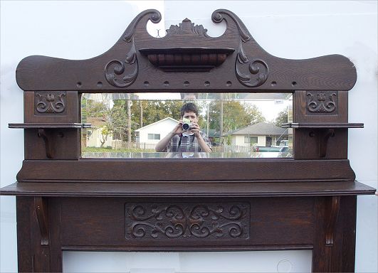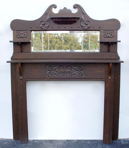 LATE 19TH C EARLY 20TH C OAK MANTLE WITH MIRROR TOP: Applied carved crest over the beveled mirror. The mantle is 47''h, the mirror adds another 30'' to the height, 59''w. , the hearth has a 42'' x36'' opening. Dark finish.