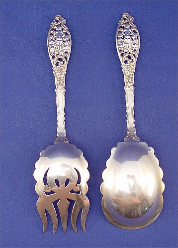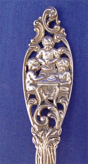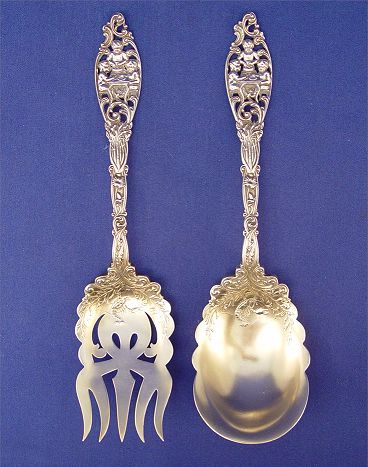 DOMINICK & HAFF ''LABOR OF CUPID'': 1) Large vegetable serving spoon 9 1/4'' long 2) Large meat fork 9 3/8'' long. Pierced handles depicting 3 cupids, bear bottoms verso. Approx. 9.23 oz.
