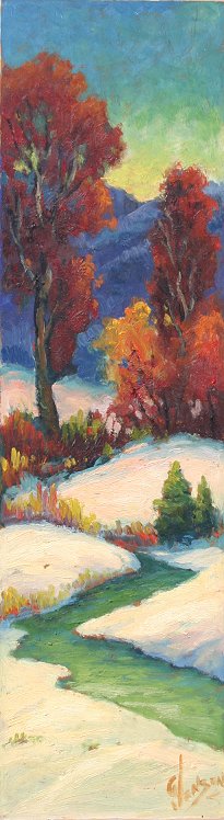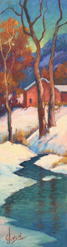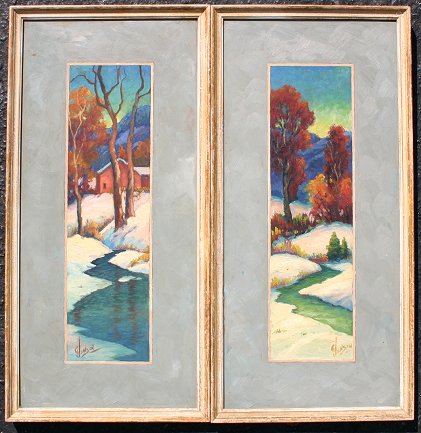JENSEN, George, (American, 1878-): Pair of Early Winter Landscapes, Oil/B's, image size 18'' x 5'', artist painted background faux mat, full size measures 24'' x 11'', signed, framed, 25'' x 12''. Est. $800/1200**