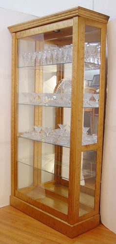CONTEMPORARY ILLUMINATED DISPLAY CABINET BY PULASKI: Unusual sliding front, the door slides open for an ''invisible'' entrance, glass shelves. 81 3/4''H. x 42'' x 16''.