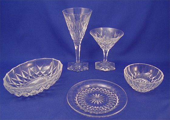 TREMENDOUS LOT OF SIGNED VAL ST LAMBERT ''HAFNIA CUT FANTAISIE'' CRYSTAL STEMWARE AND TABLEWARE: 69 pieces to include 17 tall goblets (7 5/8''), 12 wine (6 1/8''), 14 champagne (4 7/8''), 12 plates (6 1/4''), 12 bowls (4 3/8''), and 2 oval serving bowls, 8 1/2'' dia.
