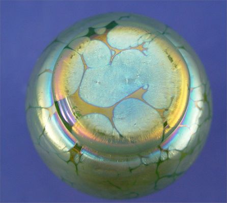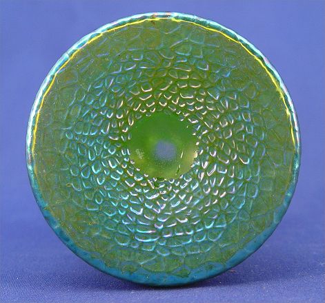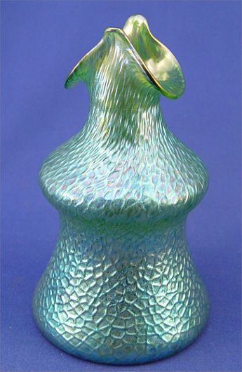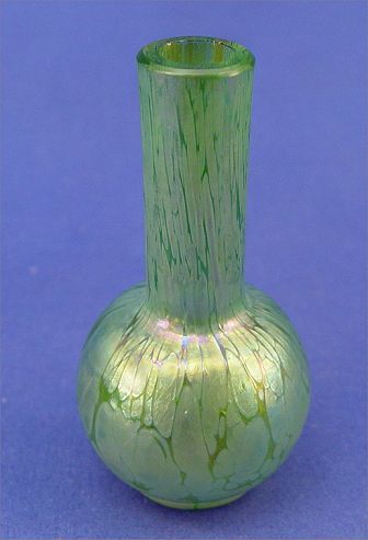 2 PIECE GREEN IRIDESCENT ART GLASS VASES: Possibly Loetz, 7'' and & 4 1/2'' high.