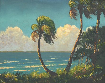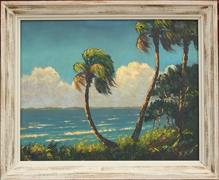 NEWTON, Harold, (American, 2oth C.): Highwaymen Beach Scene with Palms, Oil/Upson, 24'' x 30, signed, framed, 28'' x 34''. Est. $1500/2500**