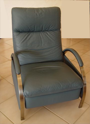 MODERNE DESIGN INSTITUTE OF AMERICA LEATHER & CHROME CHAIR: Nice leather. Measures approx. 40'' high X 29 1/2'' across X 25'' deep.
