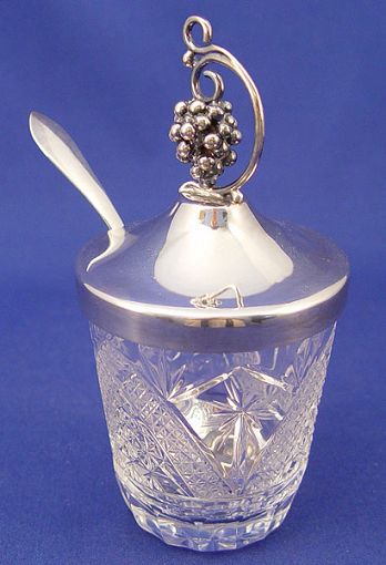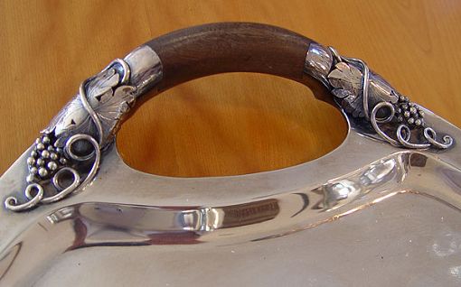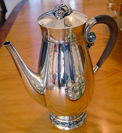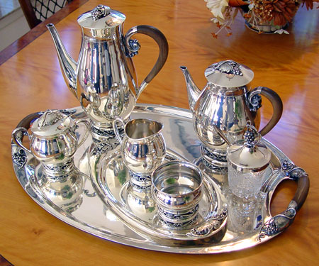 LARGE CODAN MEXICAN STERLING TEA SERVICE PLUS: Grape Danish style design. The set includes a large tray (22 1/2''l), coffee or hot water pot, (11''), teapot (8''), cream pitcher, cut glass sugar with sterling top. Sold with a matching sterling tray (12''), a cream pitcher and open sugar. Approx. 199 troy oz.