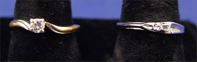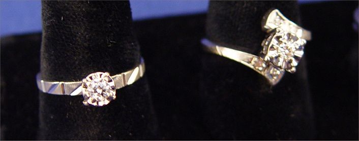 LOT OF ESTATE DIAMOND RINGS: All rings of white gold and set with approx. 3/4 CTW round brilliant cut and single cut diamonds. Largest diamond is .16 Ct. - Smallest diamonds are .01 Ct. The diamonds average VS1-SI1 in clarity and G-H-I in color. Rings to include, an 18k bridal set with one diamond of approx. 3mm x 1.5 and two tiny accent diamonds, size 4.75; Birks 18k with teeny tiny diamond, size 6; three stone ring of 14k with center stone of approx 3mm x 1.5mm with two tiny side stones, size 5.75; etched band of 14k with raised fluted ring mounting for the small diamond, size 6; 14k with yellow gold flare accents, diamond measures approx. 3.5 x 1.8, size 5.75, please note slight bend; 14k ''Fiance''' ring at one time part of set with prong attachment, tiny diamond, size 6; and a 14k bypass style ring with etching and tiny diamonds to the arms, center stone raised in a floral motif mount, measures approx. 3 x 1.8mm, size 5.5. Sold as a lot. Approx. total wt. 10.5 grams 14k, 7 grams 18k.