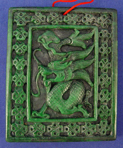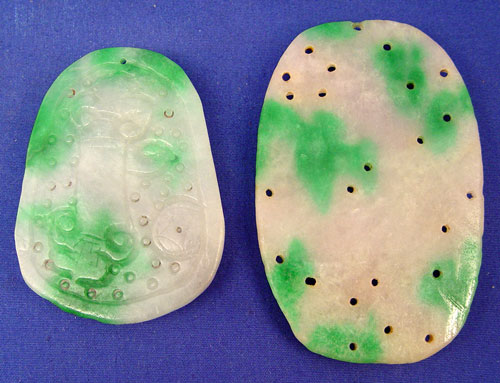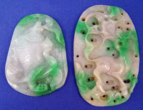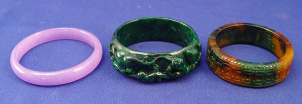 3 JADE PLAQUES, 2 JADE BANGLE BRACELETS: 6 piece lot to include 1) Dark green deeply carved jade bangle bracelet, 2 3/8 wrist, 7/8'' wide. 2) Orange and green jade bracelet with incised carvings, 2 1/4'' wrist opening, 3/4'' wide. 3) Lavender jade ( or Peking glass) bangle bracelet, 1/2'' wide. 4) A dark green 3 1/2'' x 2 5/8'' dragon plaque 5) Fish carved plaque, 3'' x 2 1/4''. 6) Mythical beast carved and pierced plaque, 4'' x 2 1/2''.
