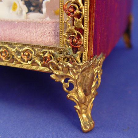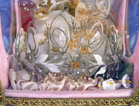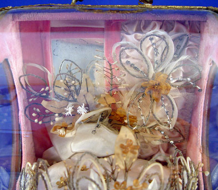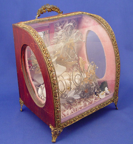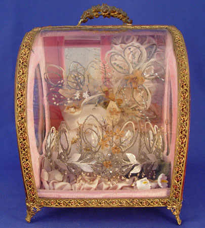 19TH C FRENCH WEDDING DOME: Charming French custom of keepsaking. Wood and glass box filled with mementos of a bride. At the front is a beaded tiara crown, in the rear are beaded flowers. 9 1/4'' x 8'' x 6''.