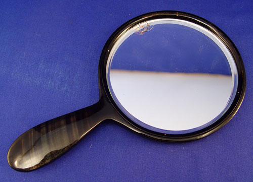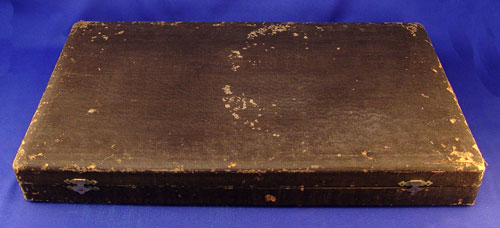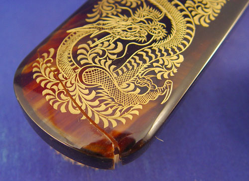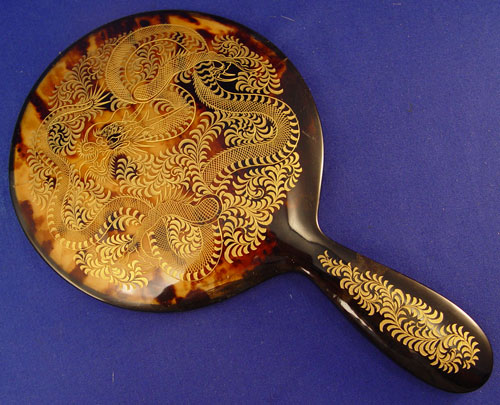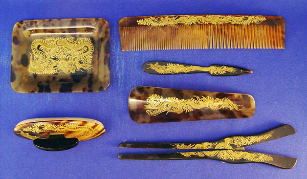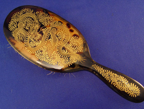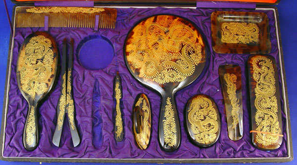 19TH C TORTOISE SHELL DRESSER SET IN PRESENTATION BOX: Eleven piece, engraved coiled dragon design with gold enhancement. Includes glove stretcher, nail file, nail buffer, shoe horn, hair brushes and mirror, pin tray and comb.