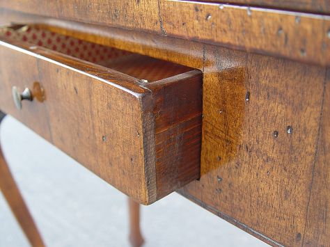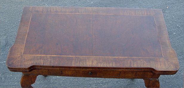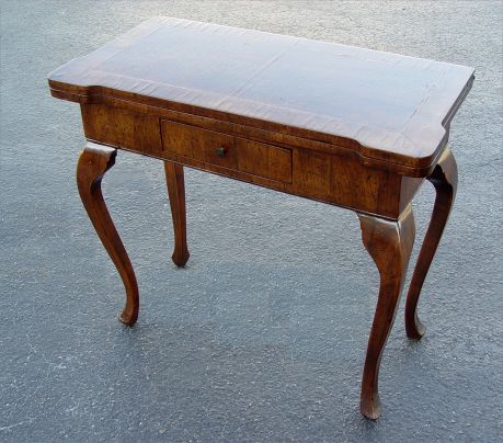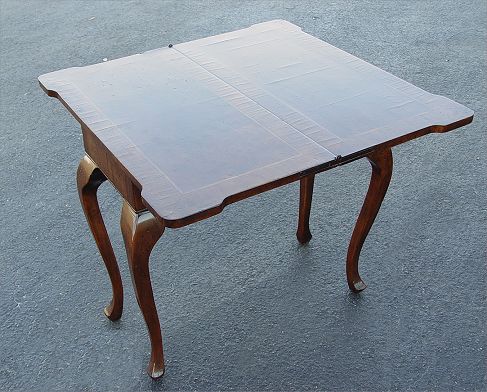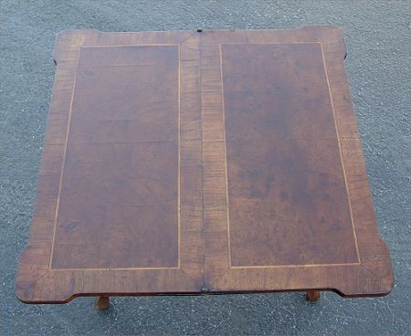 19TH C QUEEN ANNE GAME TABLE: Banded inlay and shaped top with single drawer to frieze, walnut and kingwood veneer, 29''h., 32'' square when open.