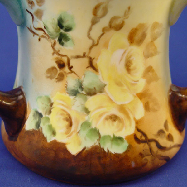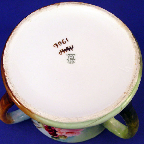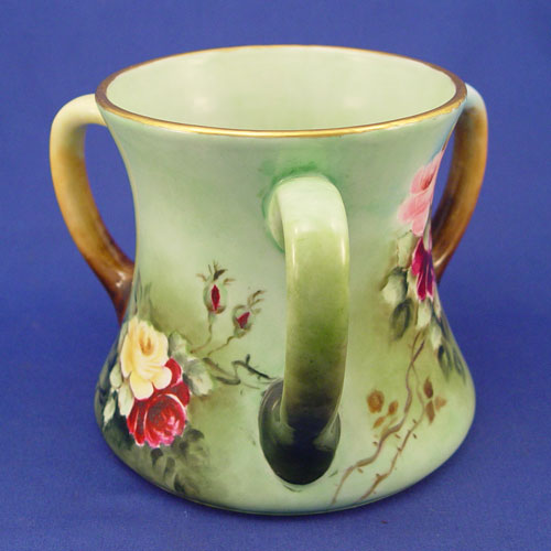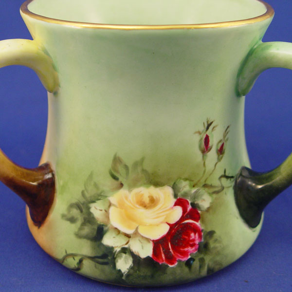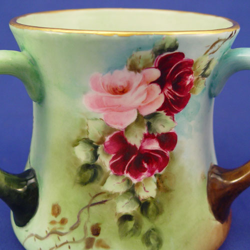 HAND PAINTED 3 HANDLE FRENCH LIMOGES LOVING CUP: Rose decorated, hand painted. Marked with Guerin, Mark Limoges France mark, 1900-1932. Artist signed MMP 1906. 6'' high X 5 3/4'' top dia., 6 3/4'' base dia.