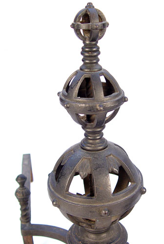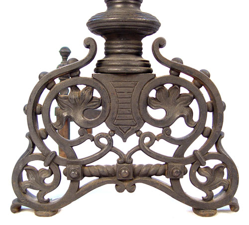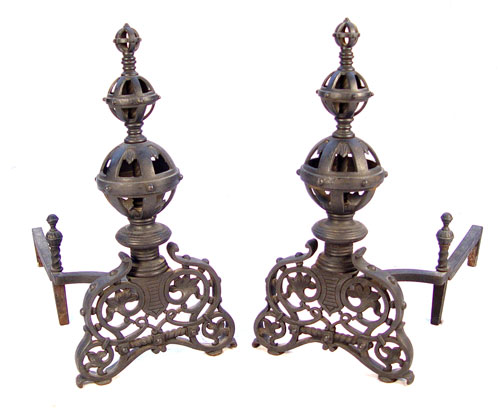PR VICTORIAN CAST IRON ANDIRONS: Black iron, numbered 9518. 22''h x 11''w