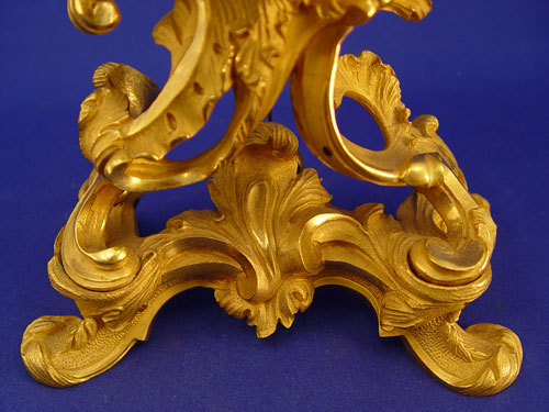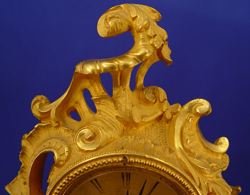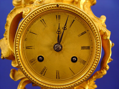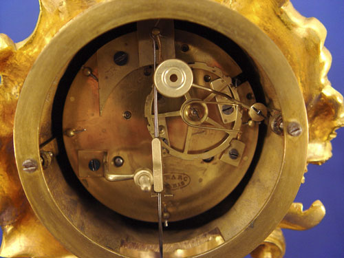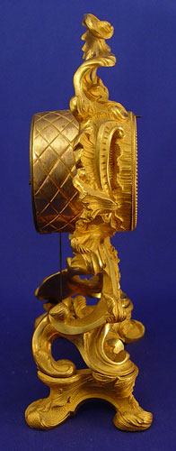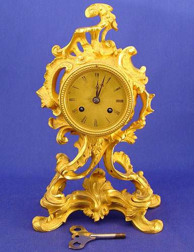 FRENCH ROCOCO SHELF CLOCK: The brass works are marked ''** Mark A Paris''. Time Strike, key wind. Gilt bronze? case, 11 1/2'' high. Brass dial painted Roman numerals.
