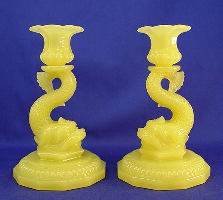 PAIR YELLOW GLASS DOLPHIN CANDLESTICKS: Opaque glass, 7 1/2'' high, fluoresces under a black light.