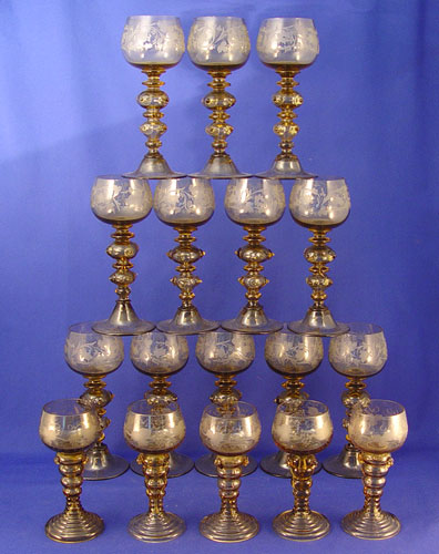 ITALIAN HAND BLOWN STEMWARE: Applied pruints, amber in color, 17 pieces to include 12 wine, 7 3/4''h., and 5 at 5 3/4''h.