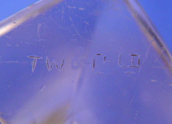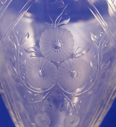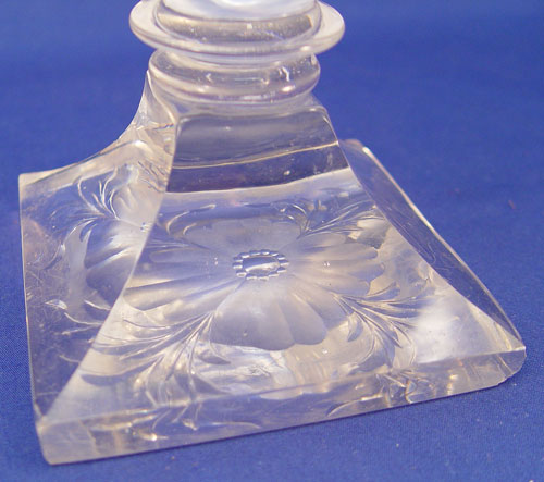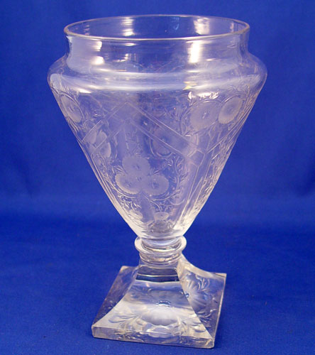 SIGNED CUT GLASS VASE: Signed TW & C Ld, etched cut floral design, square base. 9 1/2''h., the base is 3 3/4'' square. Please note chip on one corner.