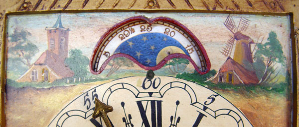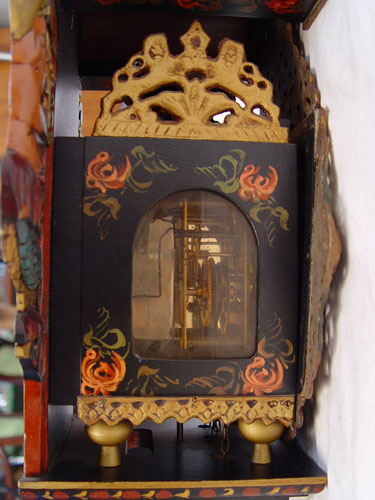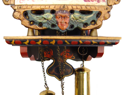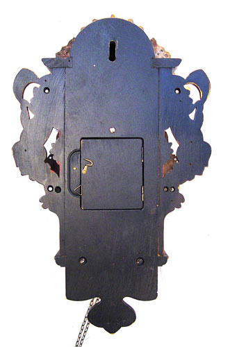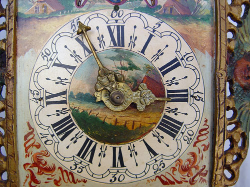 WUBA WAG ON THE WALL CLOCK: Polychrome metal ornamentation, hand painted dial, weight driven. 18''. x 10'' x 6''.