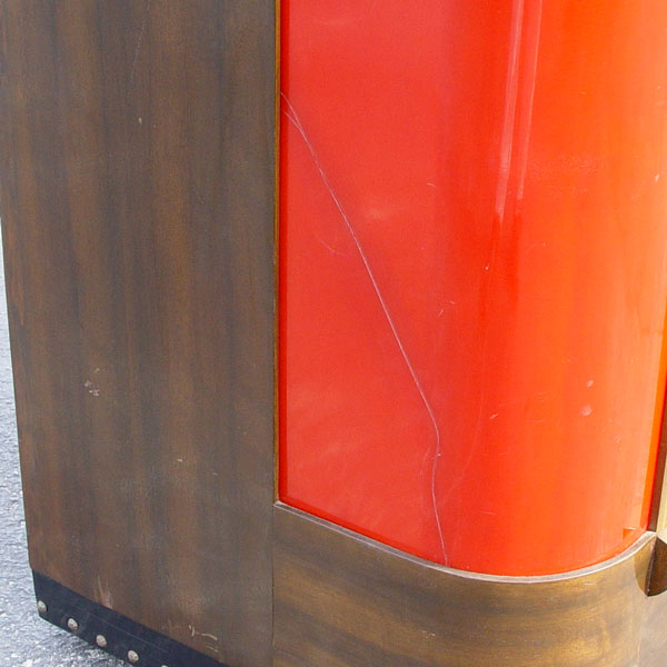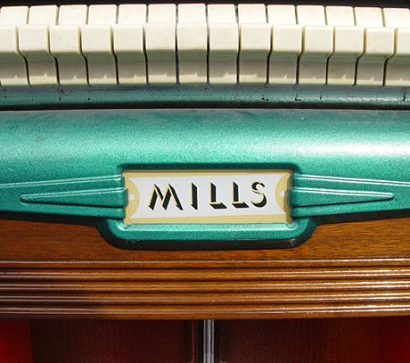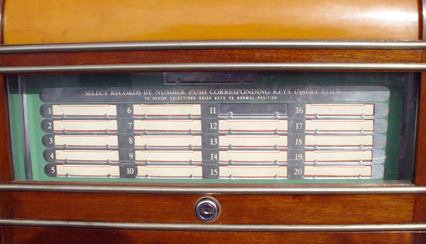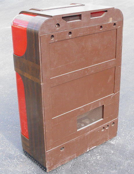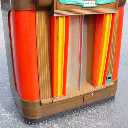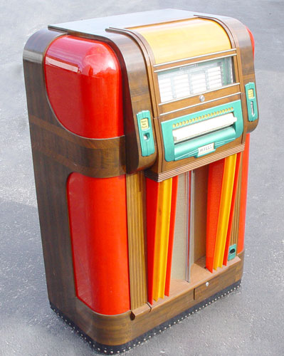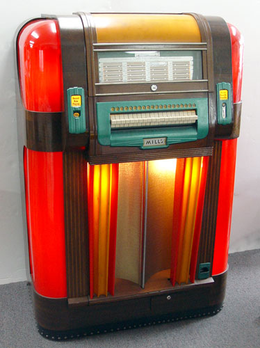 MILLS 1939 BAKELITE THRONE OF MUSIC JUKE BOX: 1939-1941. Art deco design. Holds and selects 20 78 rpm records. Bakelite and richly grained walnut veneer front and sides. Measures 56 1/4'' tall X 37 1/2'' across X 24'' deep. In working order, but will need re-wiring for safety.