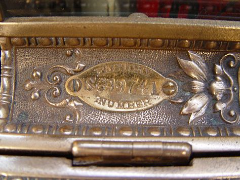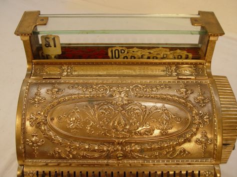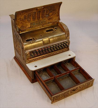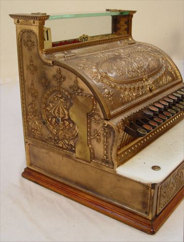 ORNATE NATIONAL CASH REGISTER: Works in British pounds. Marked on top plaque ''National Cash Register Co. Dayton Ohio'' with last patented date of June 16 '97. Factory number S699741. Has keys. Very minor under rim chip to marble. 17'' high X 18 1/2'' across X 16'' deep. Shield on back reads ''National Dayton Ohio USA''. Excellent brass.