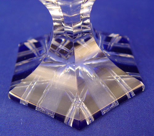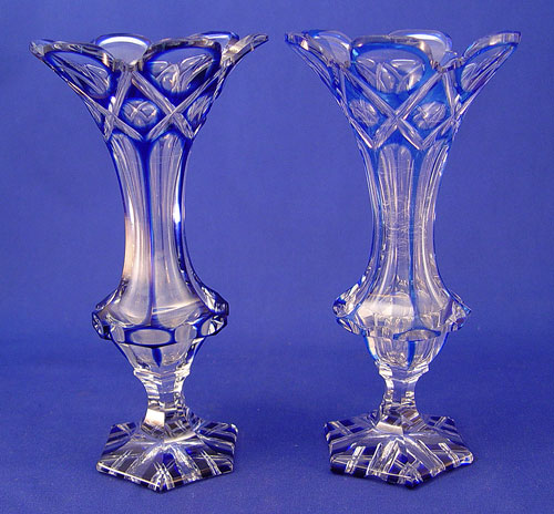 PAIR 19TH C BLUE CUT TO CLEAR VASES ATTRIBUTED TO SANDWICH: 8 5/8'' high, 4 1/2 top dia. 3 1/4'' across base. No chips or cracks, some interior scratches.