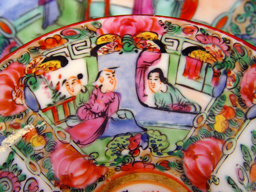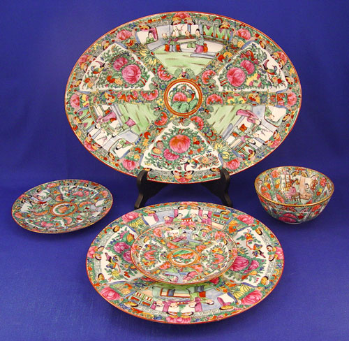 CHINESE ROSE MEDALLION CHINA: 89 pieces to include 10 dinner plates (10'' dia), 12 bread plates (6'' dia), 7 soup bowls, 21 cups in different styles, 19 saucers, 2 demi cups, 1 saucer, 3 plates (7 1/2'' dia), 2 low bowls, 3 soup plates, nest of 3 serving bowls, covered server, oval platter and chop plate, covered sugar, 2 shakers. Made in Hong Kong, variety of marks.