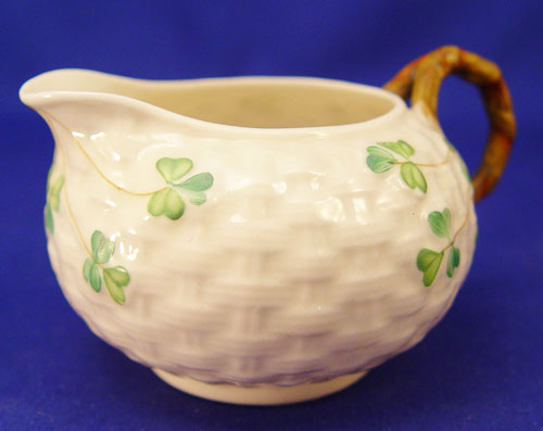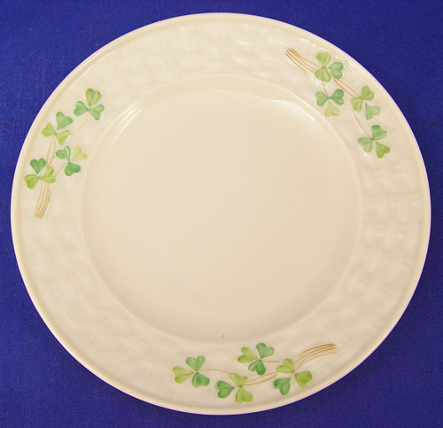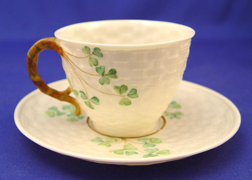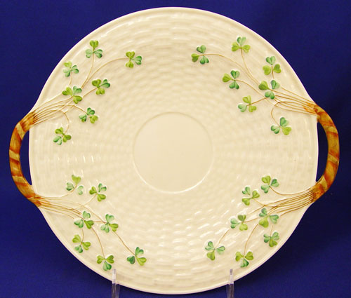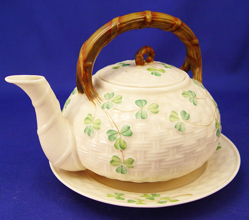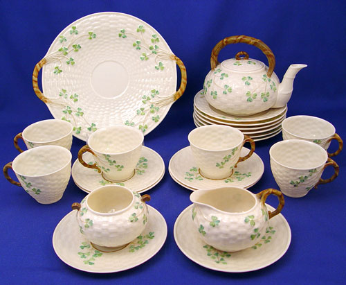 BLACK MARK IRISH BELLEEK SHAMROCK DESSERT SET: 23 pieces to include teapot, open handle cake plate (9 1/4'' diameter), cream pitcher, open sugar, 6 plates (6 1/2'' diameter), 6 cups and 6 saucers. All bear the black mark.
