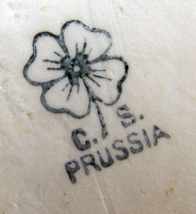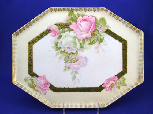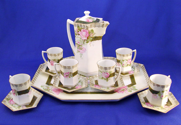 CS PRUSSIA ROSE DECORATED FINE CHOCOLATE SET: Includes tall pot, 6 cups and 6 saucers (2 with chips), and a tray 14 1/2'' X 11''. Carl Schlegelmilch.