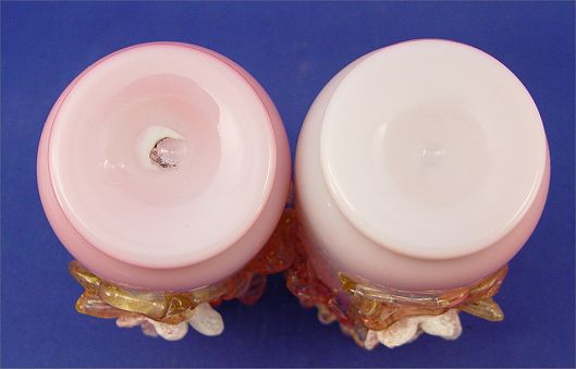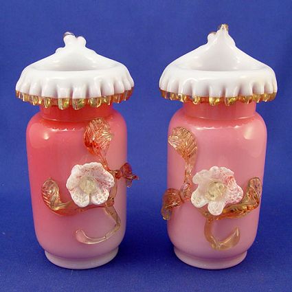 PAIR WILLIAMS & STEVENS ART GLASS VASES: Victorian art glass vases with applied floral decor. Rolled and crimped rims. 8'' high.