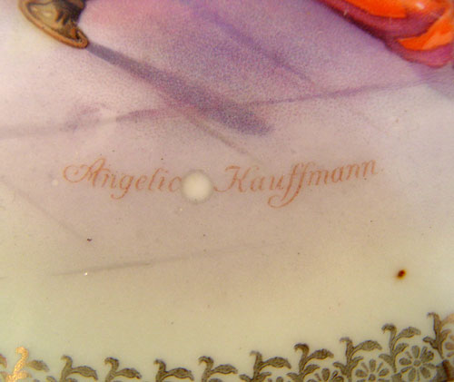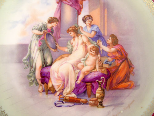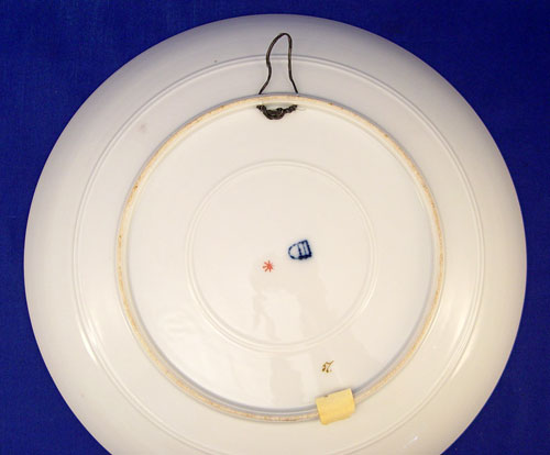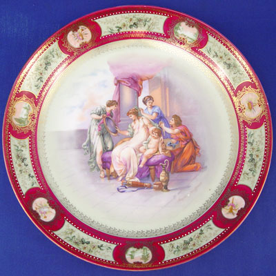ROYAL VIENNA CHARGER: Center scene after Kauffman. Blue beehive and red star marks under glaze. 11 3/4''dia.