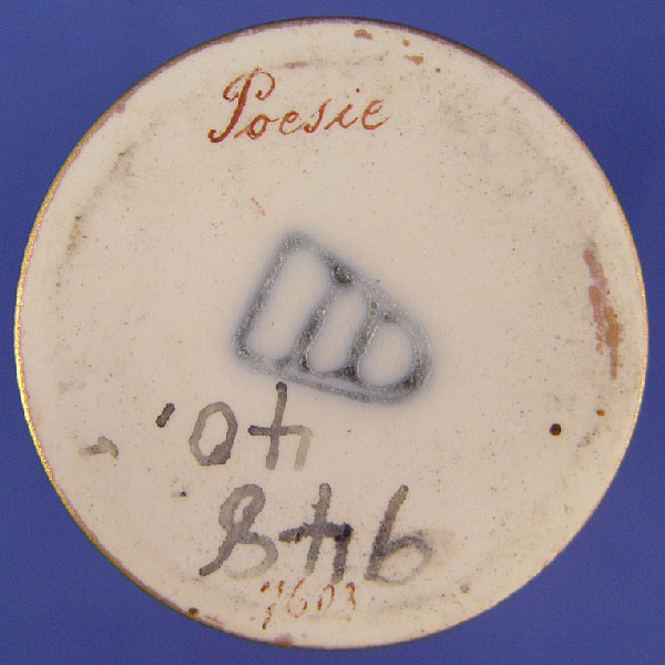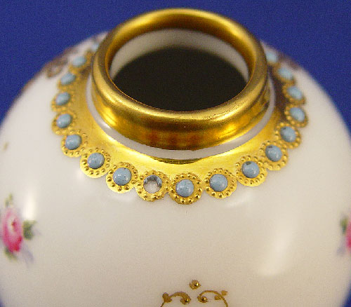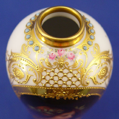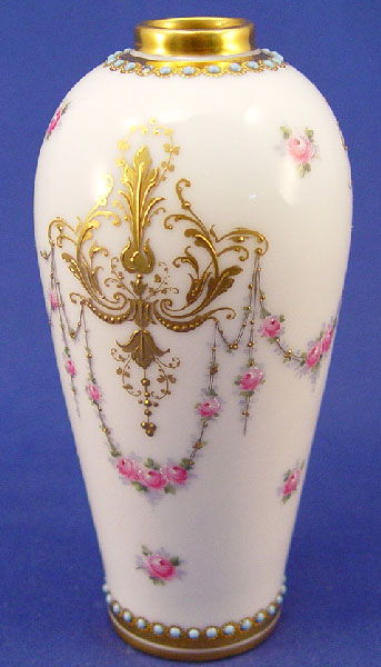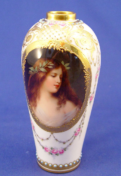ROYAL VIENNA HAND PAINTED VASE SIGNED WAGNER: Portrait of ''Poisie'', rose swags, gold and enamel beading. 5 1/2''h.