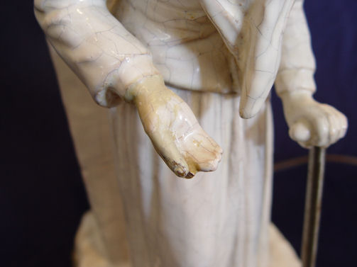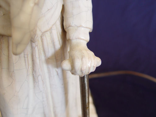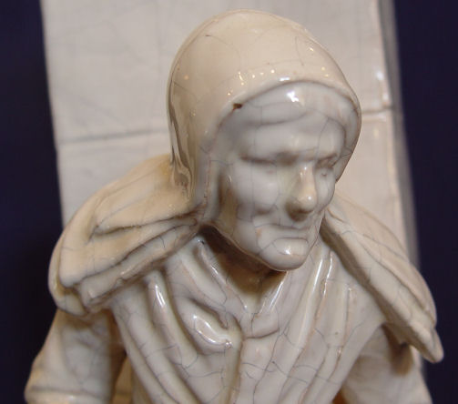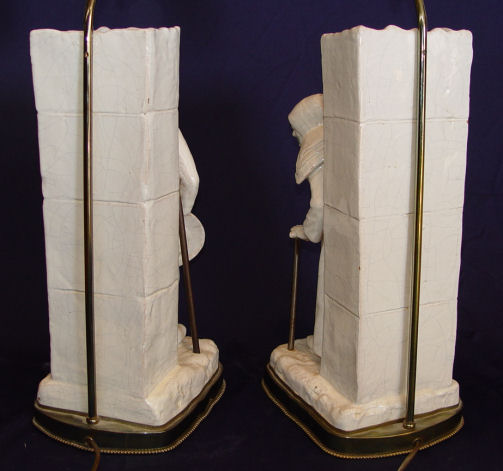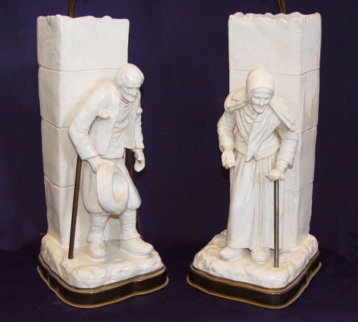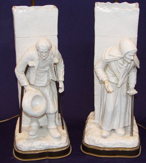 PAIR GEORGE MARTEL FRENCH FAIENCE FIGURAL VASES / LAMPS: Ca. 1900-1942. Vases mounted and drilled as lamps. Signed ''Geo Martel'' on the underside. Restoration on her hand, thumb loss on his. The ceramics are 16 1/2'' h. x 7 1/2'' x 6 1/2''., the lamps are 36'' h. overall.