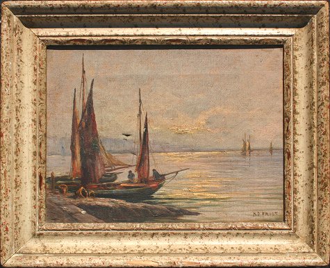 FROOT, H.D., (Belgium, 20th C.): Coastal Scene with Boats, Oil/C, 9'' x 12'', signed, painted frame, 13'' x 16''. Small puncture, needs cleaning. Est. $300/500**