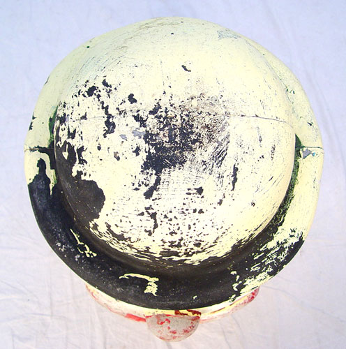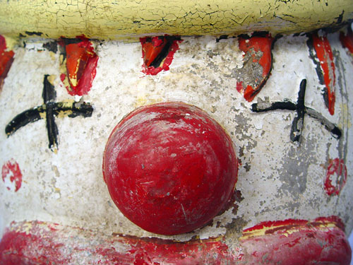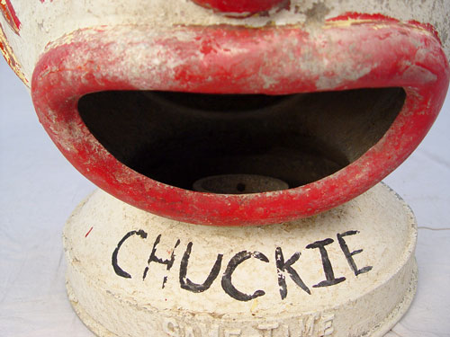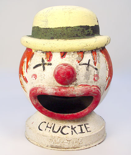 ALUMINUM CARNIVAL GAME CLOWN HEAD by GAME TIME: Vintage double sided clown face marked ''Game Time Litchfield Mich''. 25'' tall, overall 20'' diameter. Hand painted ''Chuckie'' name on both sides on base, some paint loss.