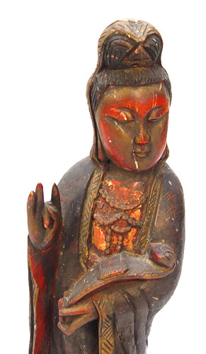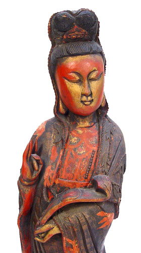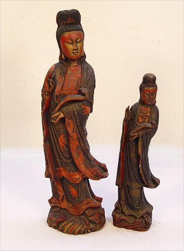 2 CHINESE CARVED WOOD QUAN YIN FIGURES: 1) 36'' tall X 10'' across base X 6 1/2'' deep base. Minor isolated paint loss, crackling. 2) 26'' tall X 6 38'' across base X 5'' deep. Sticker on bottom ''Republic of China''