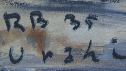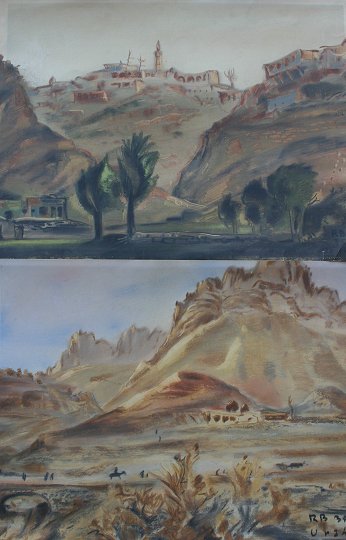 TWO DESERT MOUNTAIN LANDSCAPE PAINTINGS DATED 1935: Gouache, 17 1/2''x 23 1/2'', monogrammed R.B., dated '35, Urali?, matching wood frames with extensive wear to gesso, 25'' x 32''. One corner of the darker piece has been bent, several faint abrasions.