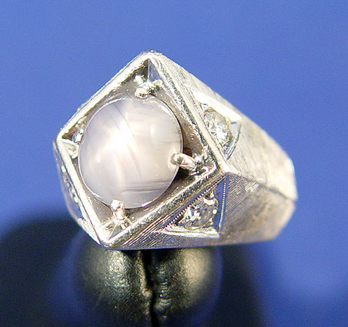 GENTLEMAN'S STAR SAPPHIRE AND DIAMOND RING: Prong set star sapphire of approx. 5.10ct in a rhombus shape mounting of 14k white gold, accented by four round brilliant cut diamonds, approx. 1/2ctw, average VS2 clarity and H color, in deep triangular settings, size 8, circa 1950-1960, 14 grams. Sold with current Florida Diamond Appraisers GIA appraisal, $3,200 retail replacement value. Est. $900/1200**