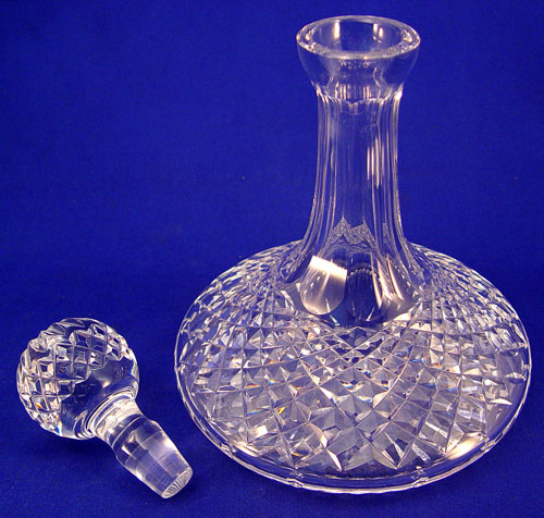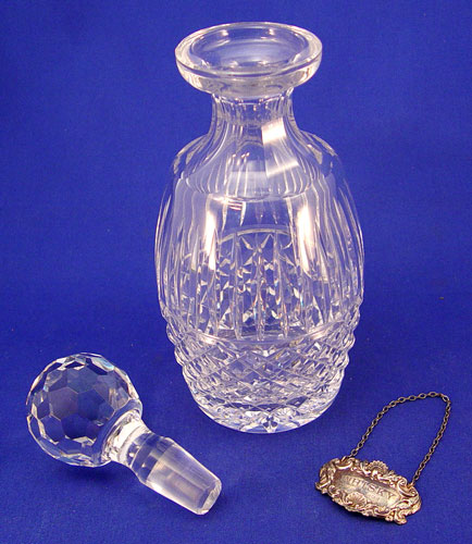 TWO WATERFORD CRYSTAL DECANTERS: 10'' ships decanter in possible the Tyrone pattern, and the other in Baltray or Maeve pattern with an English sterling whiskey label, 11''