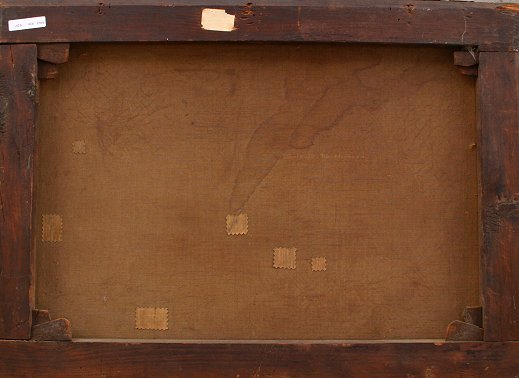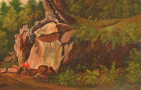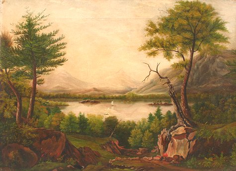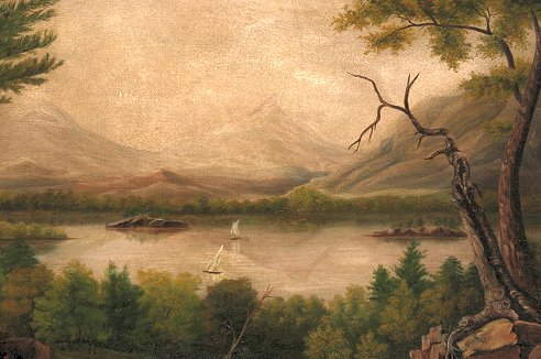 GOOD PRIMITIVE 19TH C. LAKESIDE LANDSCAPE WITH SAILBOATS AND FIGURE RESTING: Oil/C, 18'' x 25'', unsigned, unframed. Needs cleaning, several puncture repairs verso with patches.