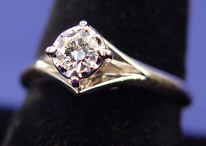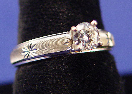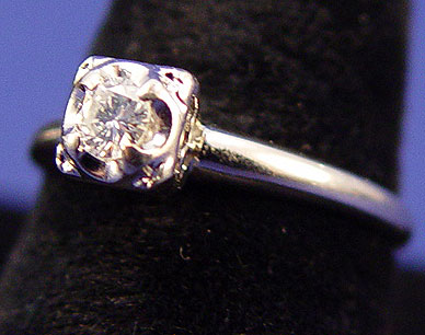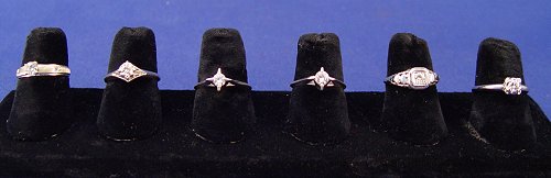 LOT OF 6 DIAMOND RINGS: All white gold with diamonds of good color and clarity to include, one 18k filigree mount, circa 1925-1935, square top set with one transitional round brilliant diamond measuring approx. 3mm x 1.8mm, approx. .15ct, VS2 clarity, G color, small chip partially disguised by prong, size 6; 14k four arm star mounting diamond measures 3.8 x 2mm, approx .20ct, VVS2 G-H and size 5.5; 14k solitaire, 4.3 x 2.5mm, approx. .30ct, VVS2 G, size 5 marked 30 Gomez; 14k Art Carved with fluted ring supporting a diamond, approx 3.8 x 2.3, .15ct, VVS2 G-H, size 5.5; square basket holding a diamond, 3.4 x 2.1mm, approx. .15ct, VVS G, size 6.5; and a band with etched shoulders below the four prong mount, diamond measures 4.1 x approx. 2.2, size 4.25. Six sparklers sold as a lot, approx. 1.22ctw diamonds and 13.9 grams total.