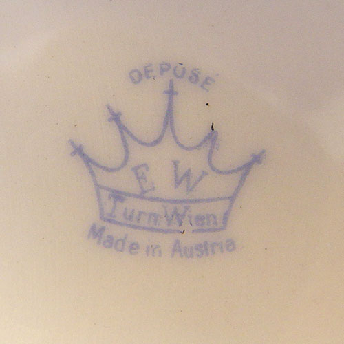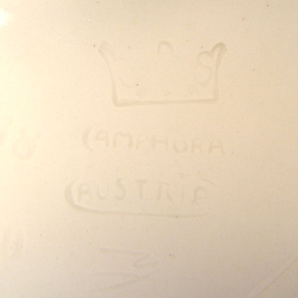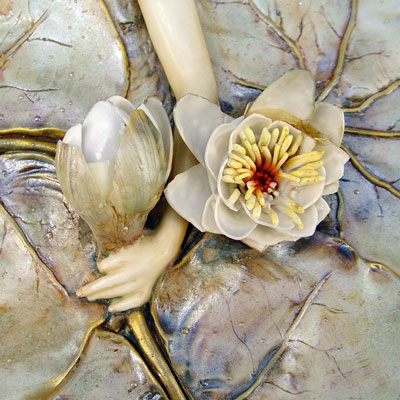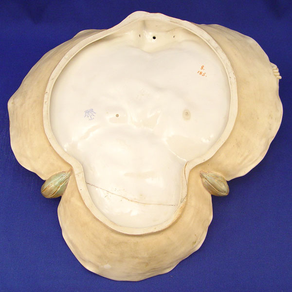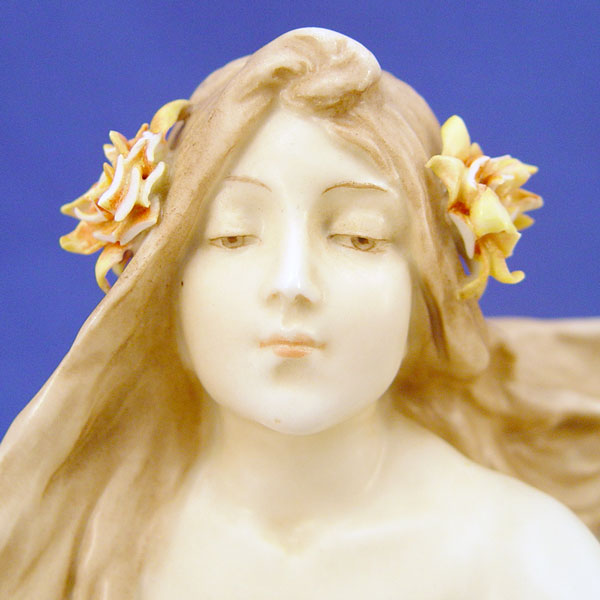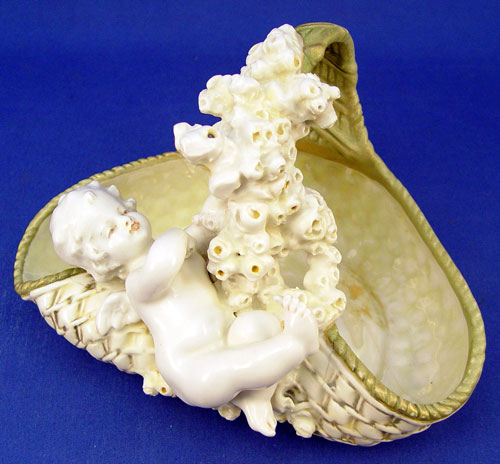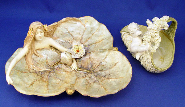 ART NOUVEAU FIGURAL TRAY AND BASKET: Porcelain figural water nymph with water lilies tray, marked ''Depose EW TurnWein Made in Austria'' 13 1/4'' X 12 1/4'' at widest points. 4 1/4'' to top of head. Cupid with coral woven basket Camphora Austria design porcelain basket. 5 1/4'' high X 8 1/4'' across X 5 3/4'' wide. Note condition on basket.